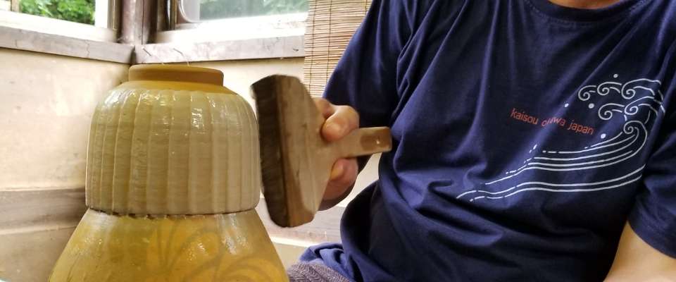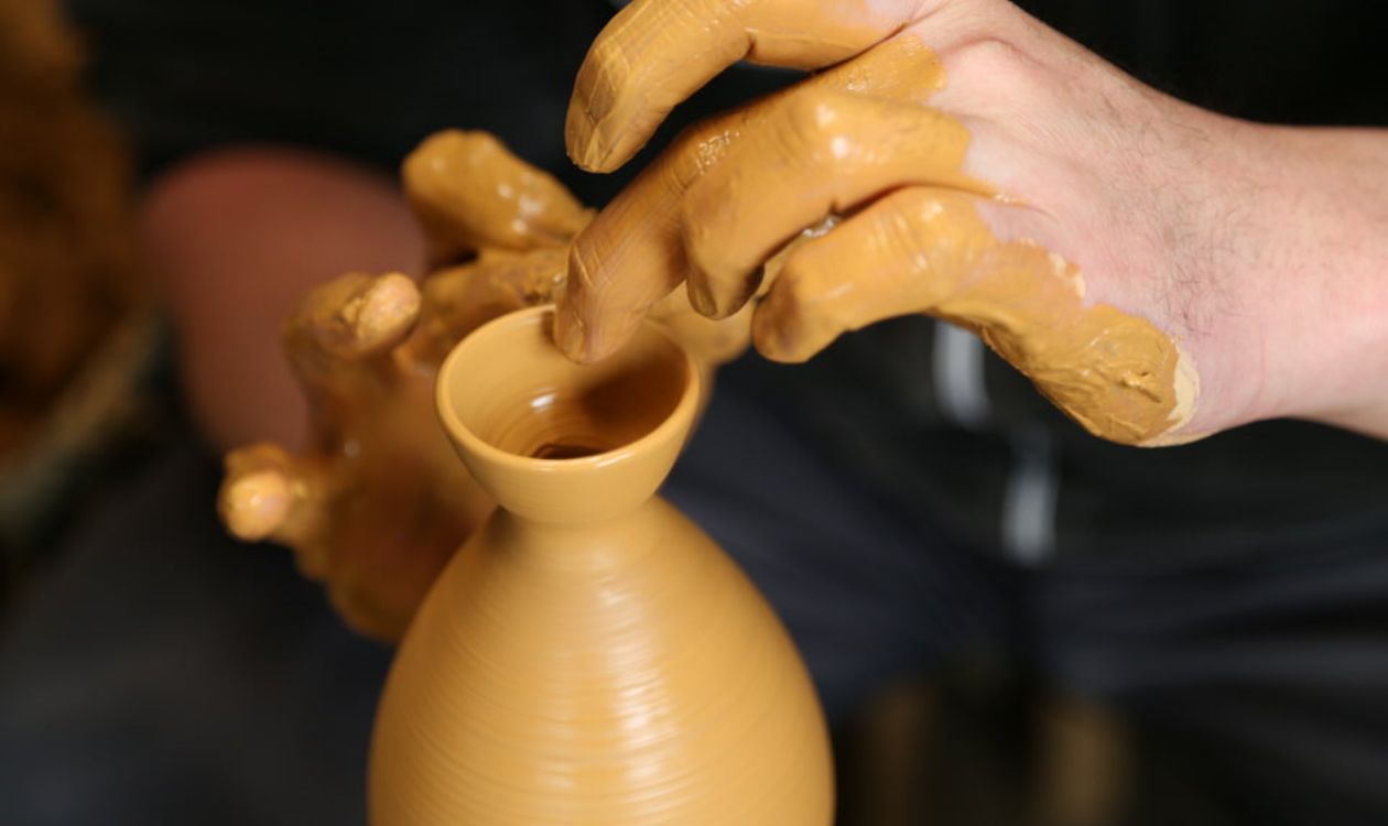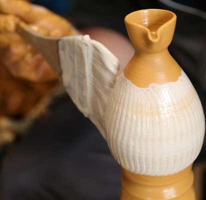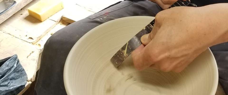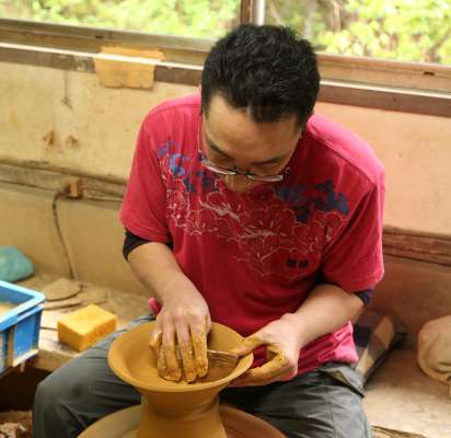 - 將乾泥土團放在陶車上旋轉的同時,透過利用舊時鐘中彈力好的彈簧加工成的刨刀,以刀尖輕觸乾泥土團